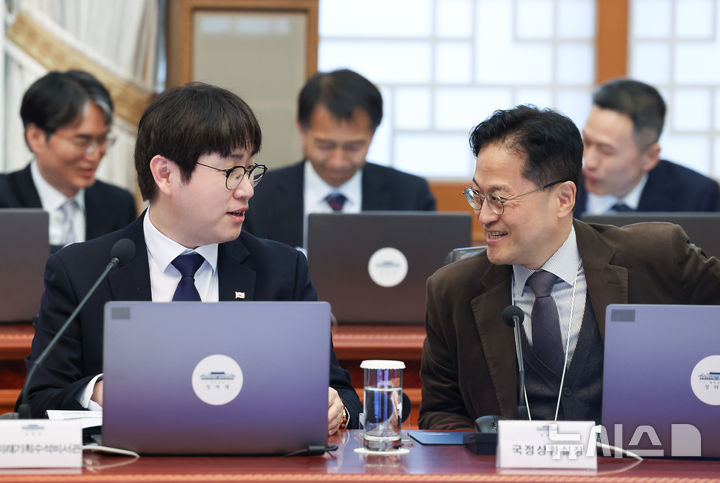 [서울=뉴시스] 고범준 기자 = 하정우 AI미래기획수석과 김정우 국정상황실장이 9일 청와대에서 열린 수석보좌관회의에서 대화를 하고 있다. (청와대통신사진기자단) 2026.04.09. [email protected]
