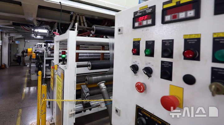 [세종=뉴시스] 강종민 기자 = 9일 세종시 전의면의 한 필름생산업체의 생산라인이 중동전쟁으로 인한 원자재 수급 부족으로 멈춰 서 있다.