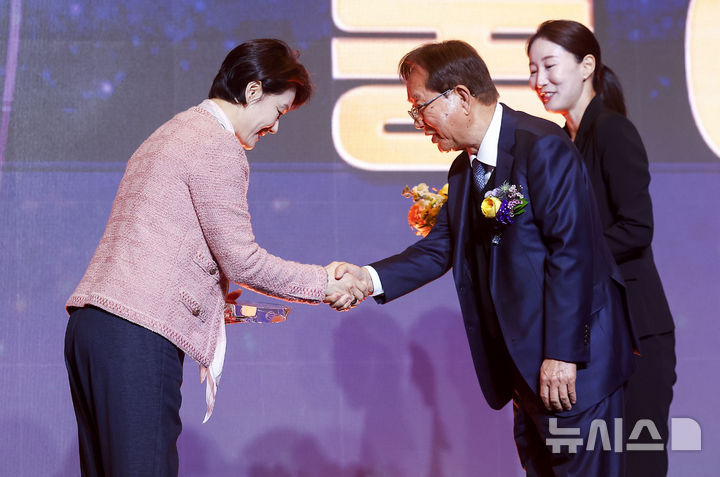 [서울=뉴시스] 정병혁 기자 = 9일 서울 강남구 그랜드 인터컨티넨탈 서울 파르나스에서 열린 2025-2026 LG전자 프로농구 시상식에서 이수광 KBL 총재가 이진숙 동아오츠카 전무에게 공로상을 전달하고 있다. 2026.04.09. [email protected]