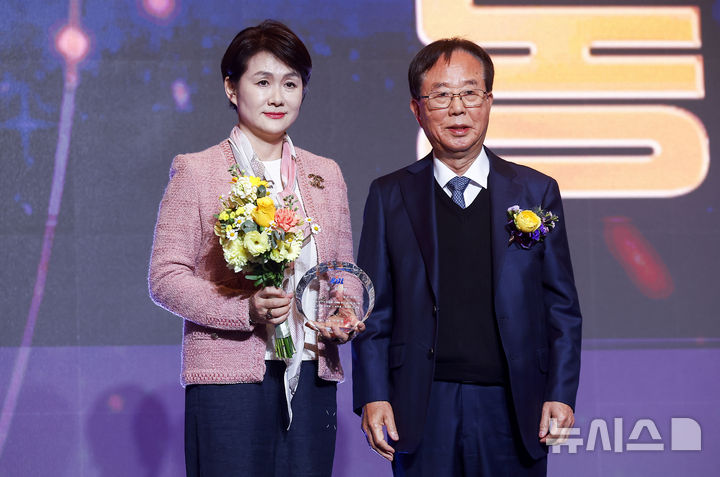 [서울=뉴시스] 정병혁 기자 = 9일 서울 강남구 그랜드 인터컨티넨탈 서울 파르나스에서 열린 2025-2026 LG전자 프로농구 시상식에서 이수광 KBL 총재가 이진숙 동아오츠카 전무에게 공로상을 전달한 뒤 기념촬영을 하고 있다. 2026.04.09. [email protected]