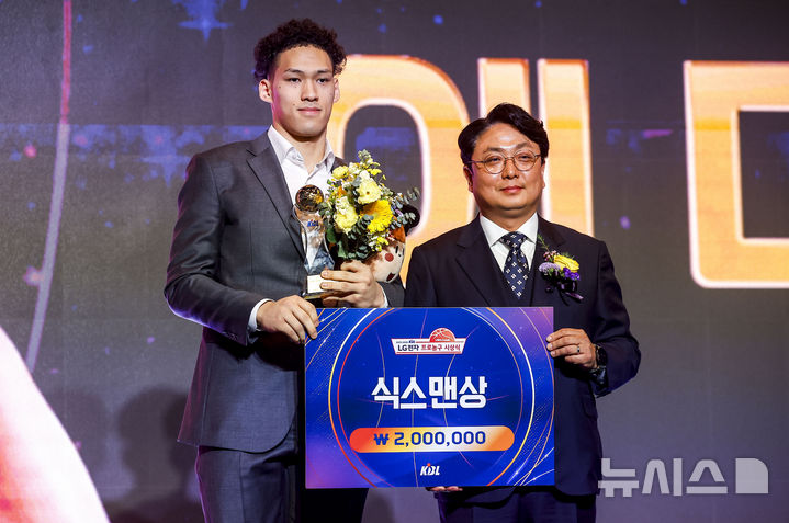 [서울=뉴시스] 정병혁 기자 = 9일 서울 강남구 그랜드 인터컨티넨탈 서울 파르나스에서 열린 2025-2026 LG전자 프로농구 시상식에서 이성구 몰텐코리아 대표이사가 서울SK 에디 다니엘에게 식스맨상을 전달한 뒤 기념촬영을 하고 있다. 2026.04.09. [email protected]