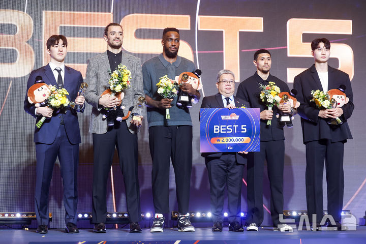 [서울=뉴시스] 정병혁 기자 = 9일 서울 강남구 그랜드 인터컨티넨탈 서울 파르나스에서 열린 2025-2026 LG전자 프로농구 시상식에서 버나뎃 테레스 페르난데즈 주한필리핀대사가 베스트5상 수상자들과 기념촬영을 하고 있다. 왼쪽부터 고양 소노 이정현, 창원 LG 아셈 마레이, 서울 SK 자밀 워니, 버나뎃 테레스 페르난데즈 주한필리핀대사, 원주 DB 이선 알바노, 서울 SK 안영준. 2026.04.09. [email protected]