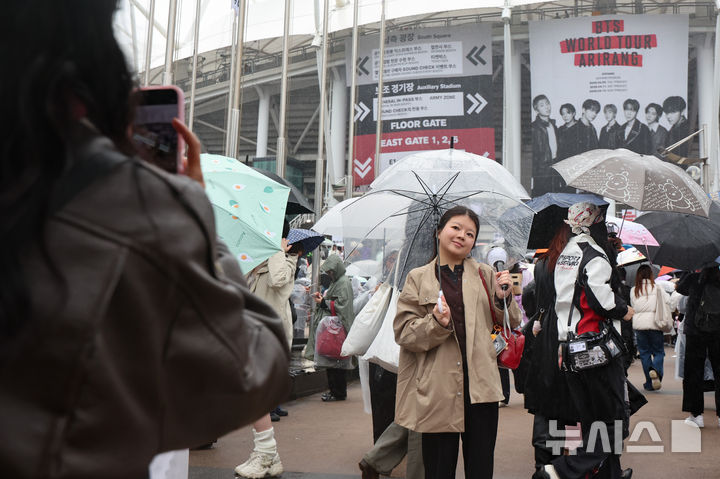 [고양=뉴시스] 황준선 기자 = 9일 오후 그룹 BTS(방탄소년단)의 월드투어 공연이 열리는 경기 고양시 고양종합운동장을 찾은 팬들이 기념촬영을 하고 있다. 2026.04.09. [email protected]