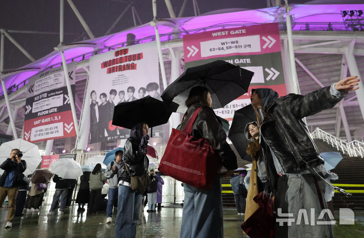 [고양=뉴시스] 황준선 기자 = 9일 오후 그룹 BTS(방탄소년단)의 월드투어 공연이 열린 경기 고양시 고양종합운동장을 찾은 팬들이 공연장 밖에서 공연을 듣고 있다. 2026.04.09. [email protected]