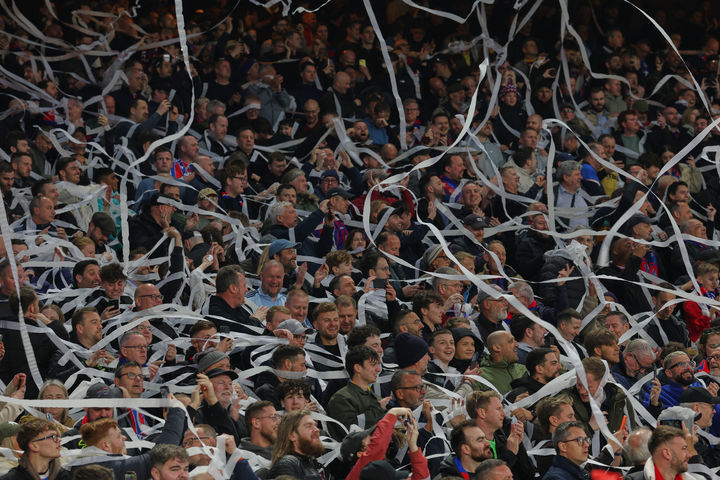 [런던=AP/뉴시스] 9일(현지 시간) 영국 런던의 셀허스트 파크에서 열리는 2025-26 유럽축구연맹(UEFA) 유로파 콘퍼런스리그(UECL) 8강 1차전 크리스털 팰리스와 피오렌티나(이탈리아)의 경기에 앞서 관중석의 팬들이 종이 롤을 던지고 있다. 2026.04.10.