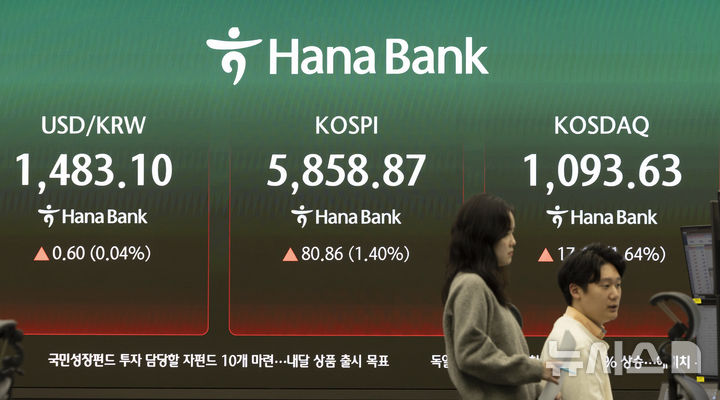 코스피는 전 거래일(5778.01)보다 80.86포인트(1.40%) 오른 5858.87에 마감했으며, 코스닥 지수는 전 거래일(1076.00)보다 17.62포인트(1.64%) 상승한 1093.62에 거래를 마쳤다. 2026.04.10. [email protected]