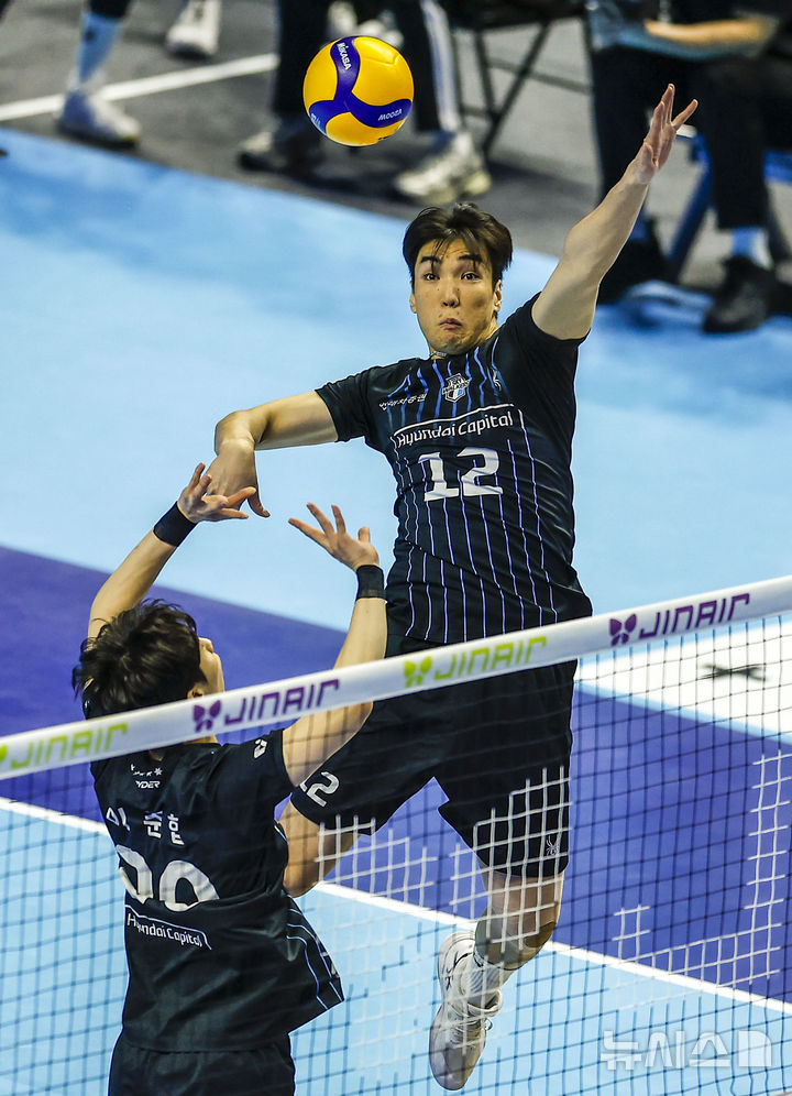 [인천=뉴시스] 정병혁 기자 = 10일 인천 계양구 인천계양체육관에서 열린 2025-2026 V리그 챔피언결정전 5차전 대한항공과 현대캐피탈의 경기, 현대캐피탈 바야르사이한이 페인트 공격을 하고 있다. 2026.04.10. [email protected]