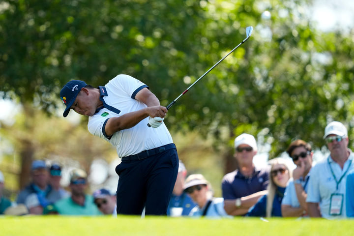 [오거스타=AP/뉴시스] 김시우가 10일(현지 시간) 미 조지아주 오거스타 내셔널 골프클럽에서 열린 미국프로골프(PGA) 투어 제90회 마스터스 토너먼트 2라운드 4번 홀에서 티샷하고 있다. 첫날 공동 48위였던 김시우는 중간 합계 4오버파 148타 공동 47위를 기록했다. 2026.04.11.