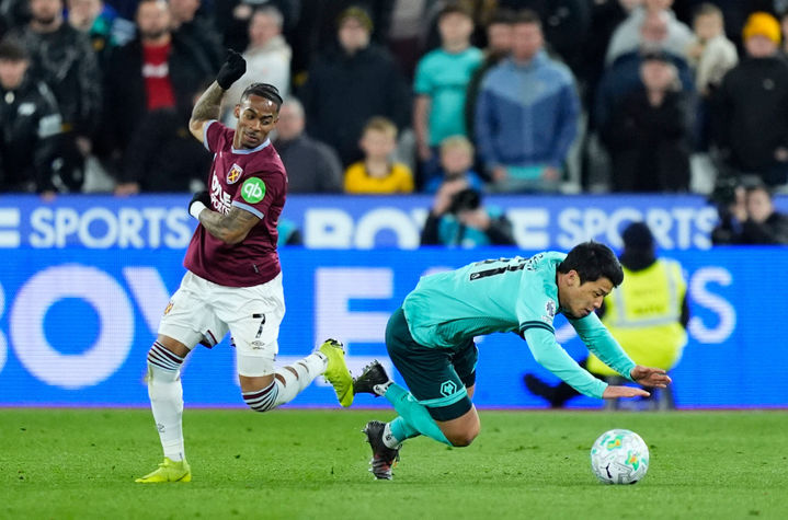 [런던=AP/뉴시스] 울버햄프턴 원더러스의 황희찬(오른쪽)이 10일(현지 시간) 영국 런던의 런던 스타디움에서 열린 2025-26 EPL 32라운드 웨스트햄 유나이티드와 경기 중 공을 다투고 있다. 황희찬은 팀이 0-3으로 끌려가던 후반 26분 교체 출전했으며, 울버햄프턴은 0-4로 패해 최하위에 머물며 강등을 코앞에 뒀다. 2026.04.11.