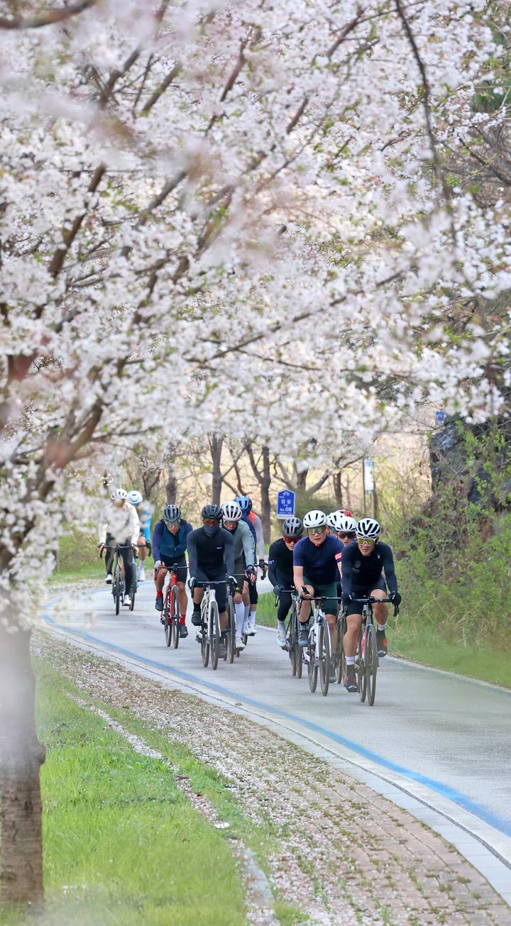 [임실=뉴시스] 김얼 기자 = 11일 전북 임실군에서 열린 '2026 옥정호 그란폰도,메디오폰도' 자전거 대회에서 참가자들이 활짝 핀 벚꽃길을 달리고 있다.(사진=임실군청 제공) 2026.04.11. [email protected]