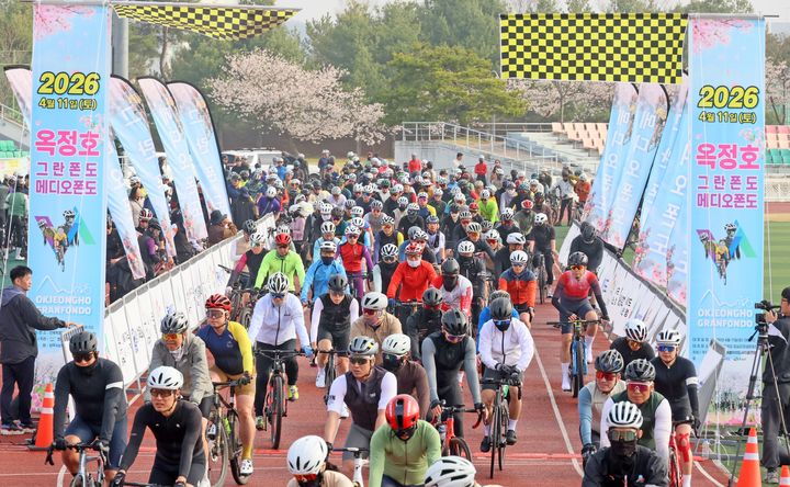 [임실=뉴시스] 김얼 기자 = 11일 전북 임실군에서 열린 '2026 옥정호 그란폰도,메디오폰도' 자전거 대회에서 참가자들이 출발 신호를 듣고 힘차게 달리고 있다. (사진=임실군청 제공) 2026.04.11. [email protected]