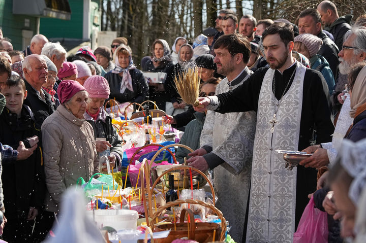 [상트페테르부르크=AP/뉴시스] 11일(현지 시간) 러시아 상트페테르부르크의 한 교회에서 정교회 사제가 부활절을 맞아 신자들과 전통 부활절 케이크, 달걀 등을 축복하고 있다. 2026.04.12.