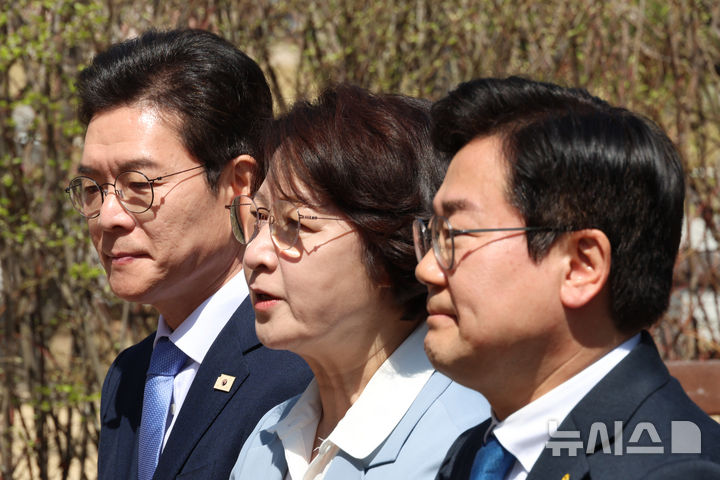 [서울=뉴시스] 고승민 기자 = 추미애 더불어민주당 경기도지사 후보가 12일 서울 여의도 국회 소통관 앞 벤치에서 열린 수도권 광역단체장 후보 '원팀 간담회'에서 인사말을 하고 있다. 2026.04.12. [email protected]