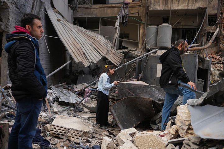 [베이루트=AP/뉴시스] 12일(현지 시간) 레바논 베이루트 중심부에서 주민들이 지난 8일 이스라엘 공습으로 실종된 사람을 찾기 위해 파괴된 건물 잔해를 수색하고 있다. 2026.04.13.