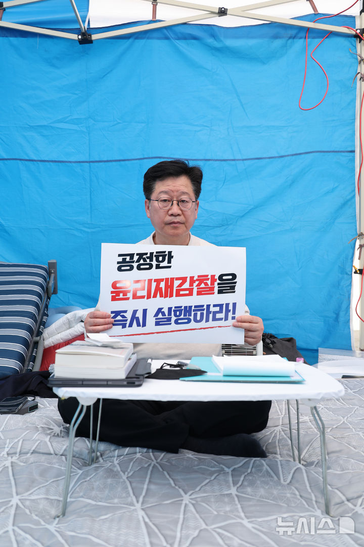 [서울=뉴시스] 김금보 기자 = 단식 사흘째인 안호영 더불어민주당 의원이 13일 오전 서울 여의도 국회 본청 앞 단식농성장에서 전북지사 후보로 선출된 이원택 의원의 ‘술·식사비 제3자 대납 의혹’에 대한 재감찰을 당 지도부에 촉구하고 있다. [email protected]