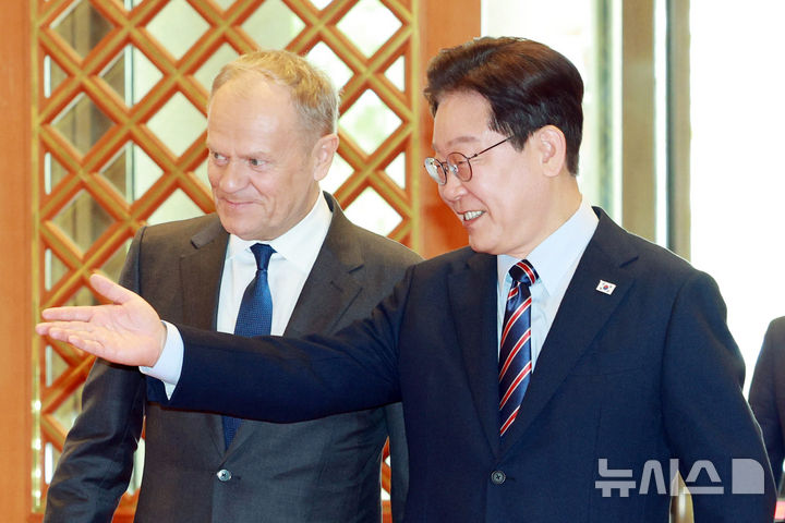 [서울=뉴시스] 고범준 기자 = 이재명 대통령이 13일 청와대에서 공식 방한한 도날드 투스크 폴란드 총리를 영접하고 있다. 2026.04.13. [email protected]
