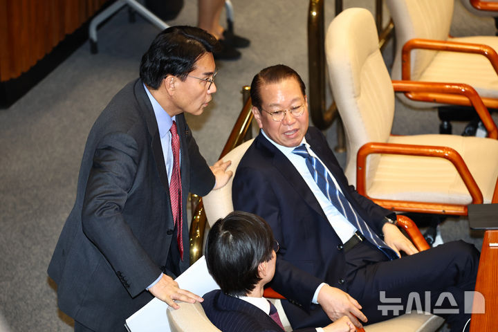 [서울=뉴시스] 김명년 기자 = 윤상현 국민의힘 의원이 13일 서울 여의도 국회 본회의에서 권영세, 조경태 의원과 대화하고 있다. 2026.04.13. [email protected]