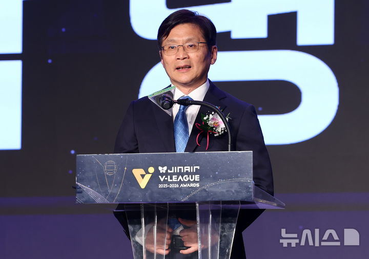 [서울=뉴시스] 이영환 기자 = 박병률 진에어 대표이사가 13일 오후 서울 광진구 비스타 워커힐 서울 비스타홀에서 열린 진에어 2025-2026 V리그 시상식에 참석해 환영사를 하고 있다. 2026.04.13. [email protected]