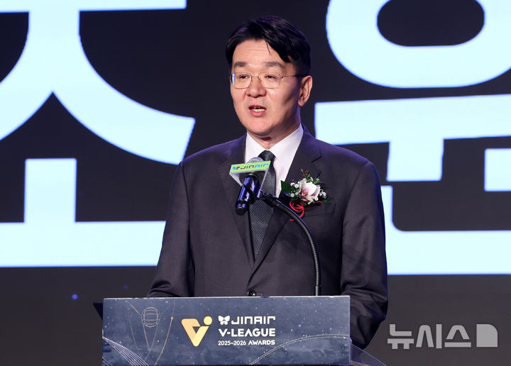 [서울=뉴시스] 이영환 기자 = 조원태 한국배구연맹 총재가 13일 오후 서울 광진구 비스타 워커힐 서울 비스타홀에서 열린 진에어 2025-2026 V리그 시상식에 참석해 환영사를 하고 있다. 2026.04.13. [email protected]