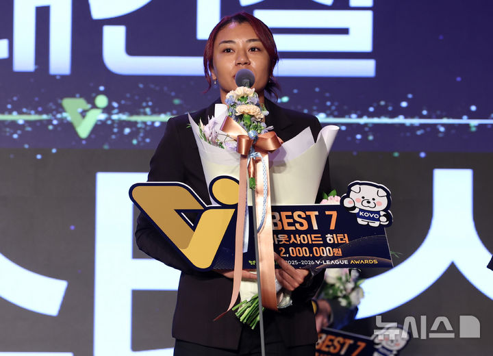 [서울=뉴시스] 이영환 기자 = 13일 오후 서울 광진구 비스타 워커힐 서울 비스타홀에서 열린 진에어 2025-2026 V리그 시상식에서 베스트7(아웃사이드 히터) 상을 수상한 현대건설 자스티스가 소감을 전하고 있다. 2026.04.13. [email protected]
