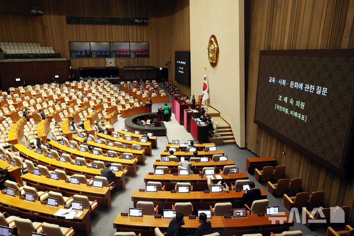 [서울=뉴시스] 조성봉 기자 = 김민석 국무총리가 13일 서울 여의도 국회에서 열린 제434국회(임시회) 제4차 본회의 교육·사회·문화 분야에 관한 대정부질문에서 조배숙 국민의힘 의원의 질의에 답변하고 있다. 의원들의 텅빈 자리가 눈에 띄고 있다. 2026.04.13. [email protected]
