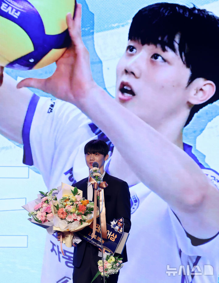 [서울=뉴시스] 이영환 기자 = 13일 오후 서울 광진구 비스타 워커힐 서울 비스타홀에서 열린 진에어 2025-2026 V리그 시상식에서 영플레이어상을 수상한 삼성화재 이우진이 소감을 전하고 있다. 2026.04.13. [email protected]