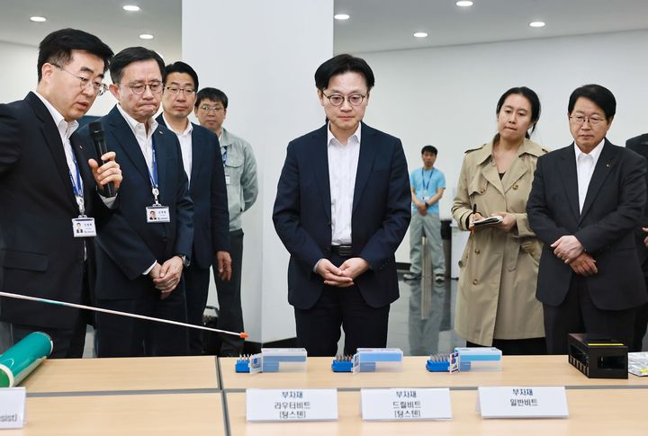 [서울=뉴시스] 김정관 산업통상부 장관이 13일 경기도 안산시 반월·시화산단 내 소재한 반도체 패키징 소재(PCB 기판) 생산 기업인 대덕전자를 방문하여 관계자로부터 회사 운영현황 및 애로사항을 청취하고 석유화학 품목의 생산·수급 상황을 점검하였다. (사진=산업통상부 제공). 2026.04.13. [email protected] *재판매 및 DB 금지