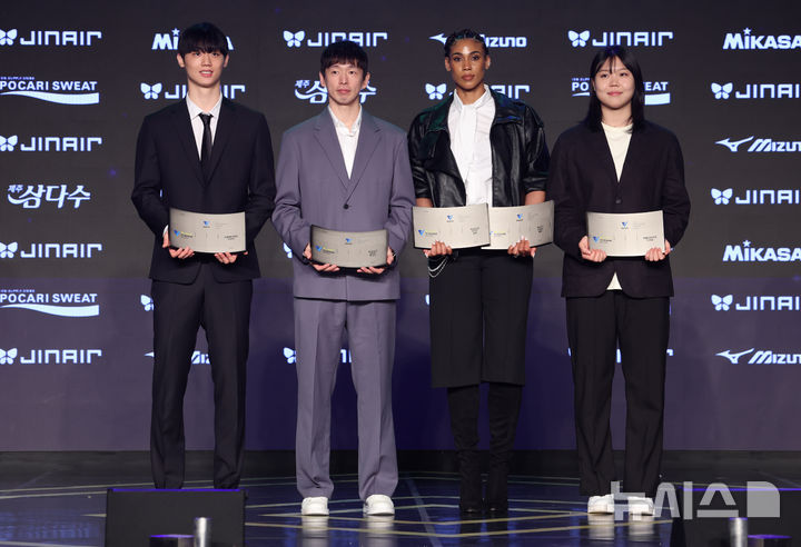 [서울=뉴시스] 이영환 기자 = 13일 오후 서울 광진구 비스타 워커힐 서울 비스타홀에서 열린 진에어 2025-2026 V리그 시상식에서 정규리그 MVP와 영플레이어상 수상자들이 기념촬영을 하고 있다. 왼쪽부터 영플레이어상 삼성화재 이우진, MVP 대한항공 한선수, MVP GS칼텍스 실바, 영플레이어상 한국도로공사 이지윤. 2026.04.13. [email protected]
