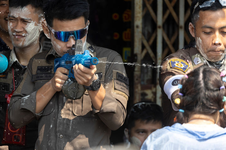 [쁘라친부리=AP/뉴시스] 13일(현지 시간) 태국 쁘라친부리에서 태국 새해를 기념해 열린 송크란 물 축제 기간 경찰관들이 참가자들과 물싸움하고 있다. 2026.04.14.