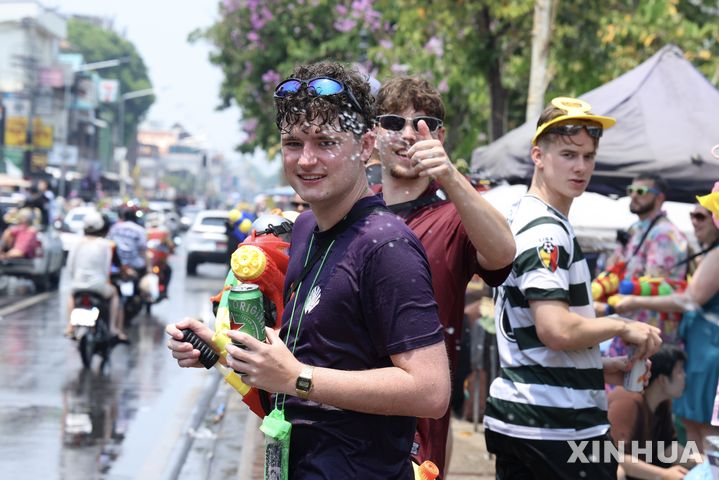[치앙마이=신화/뉴시스] 13일(현지 시간) 태국 치앙마이에서 열린 송크란 물 축제 중 외국인 관광객들이 물싸움을 즐기고 있다. 태국 전통 새해에 열리는 송크란 물 축제는 이날 개막해 15일까지 이어진다. 2026.04.14.