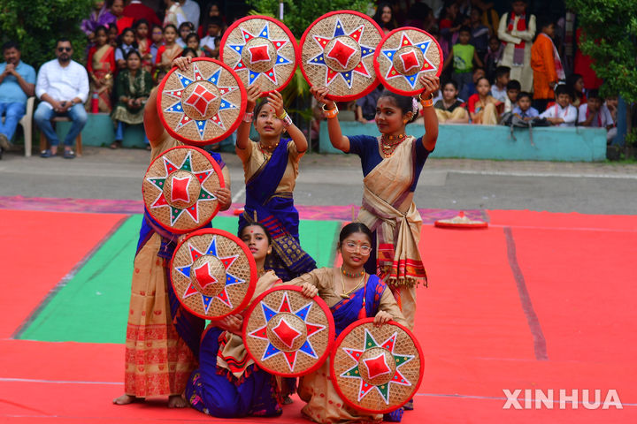 [아삼=신화/뉴시스] 13일(현지 시간) 인도 북동부 아삼주 나가온에서 봄맞이 '롱갈리 비후' 축제가 열려 전통 의상을 입은 무용수들이 축하 공연을 펼치고 있다. 2026.04.14.