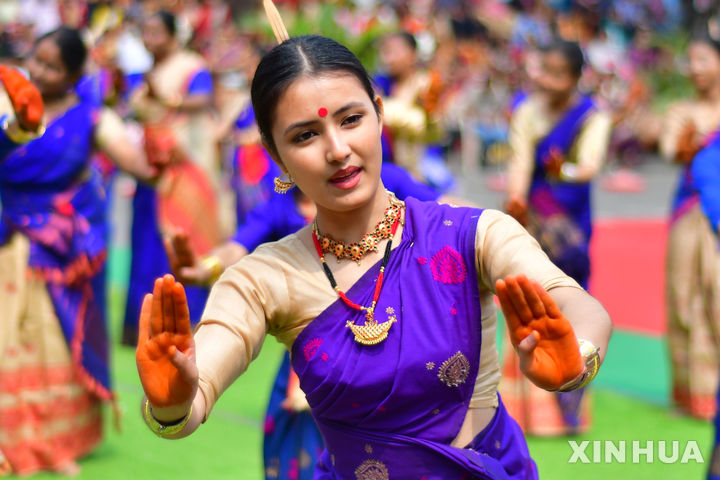 [아삼=신화/뉴시스] 13일(현지 시간) 인도 북동부 아삼주 나가온에서 봄맞이 '롱갈리 비후' 축제가 열려 전통 의상을 입은 무용수들이 축하 공연을 펼치고 있다. 2026.04.14.