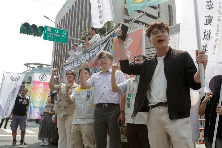 [타이베이=AP/뉴시스] 14일(현지 시간) 대만 타이베이 국민당(KMT) 당사 앞에서 시위대가 지난 10일 베이징에서 시진핑 중국 국가주석과 회동한 정리윈 주석을 규탄하는 구호를 외치고 있다. 2026.04.14.