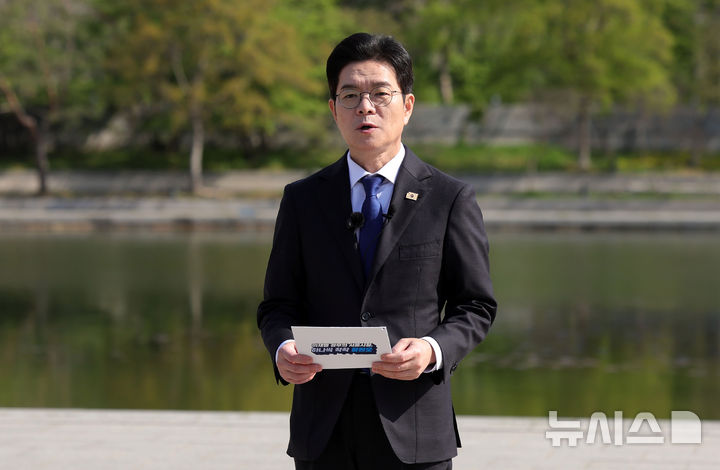 [서울=뉴시스] 홍효식 기자 = 정원오 더불어민주당 서울시장 후보가 14일 오전 서울 용산구 국립중앙박물관 호수 앞에서 여덟 번째 공약으로 문화·관광 분야를 발표하고 있다. 2026.04.14. [email protected]
