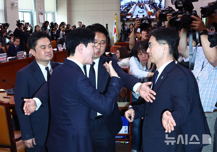[서울=뉴시스] 김명년 기자 = 쌍방울 대북 송금 사건을 수사했던 박상용 검사가 14일 오전 서울 여의도 국회 '윤석열정권정치검찰조작기소의혹사건진상규명국정조사특별위원회'에서 열린 청문회에서 증인선서를 거부한 이유로 퇴장당하고 있다. 2026.04.14. [email protected]