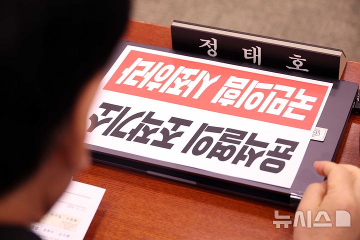 [서울=뉴시스] 조성봉 기자 = 정태호 더불어민주당 의원이 14일 오전 서울 여의도 국회 '윤석열정권정치검찰조작기소의혹사건진상규명국정조사특별위원회'에서 열린 청문회에서 '윤석열의 조작기소 국민의힘 사죄하라' 손피켓을 노트북에 부착하고 있다. 2026.04.14. [email protected]