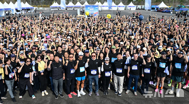 [인천=뉴시스] 박주성 기자 = 우기홍 대한항공 부회장을 비롯한 대한항공, 아시아나항공 임직원들이 14일 오전 인천 중구 BMW드라이빙 센터에서 열린 '위런(We Run)' 자선 달리기 행사에서 기념촬영을 하고 있다.