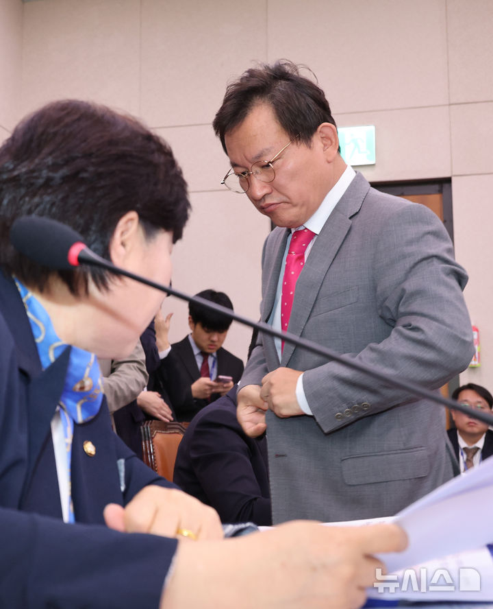 [서울=뉴시스] 김금보 기자 = 김형동 국회 '윤석열정권정치검찰조작기소의혹사건진상규명국정조사특별위원회' 국민의힘 간사가 14일 서울 여의도 국회에서 열린 전체회의에서 서영교 위원장에게 다가가고 있다. 2026.04.14. [email protected]