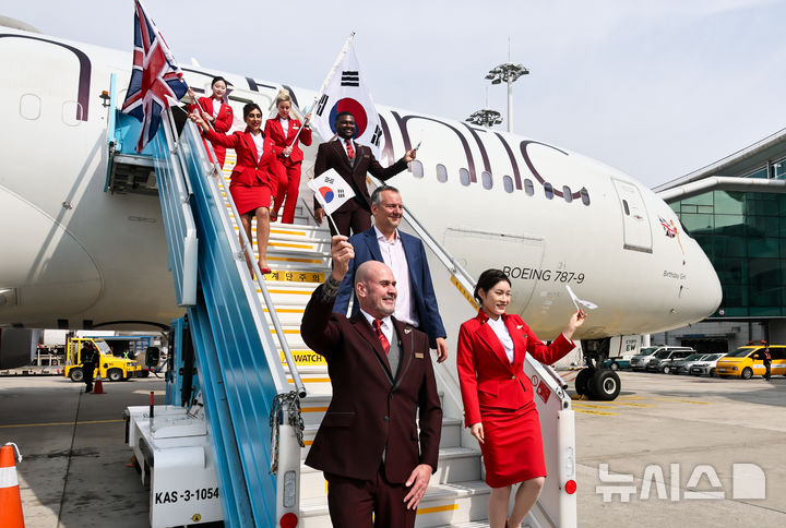 [인천공항=뉴시스] 박주성 기자 = 14일 오전 인천국제공항 제2여객터미널주기장에 도착한 영국 버진애틀랜틱의 런던 히드로발 항공기에서 최고경영자 코닐 코스터(아래에서 두 번째 줄)와 승무원들이 취항을 기념하며 인사하고 있다. 버진애틀랜틱은 인천국제공항과 런던 히드로 공항을 잇는 직항 노선을 주 7회 운항한다. (공동취재). 2026.04.14. [email protected]