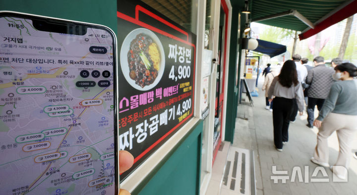 [서울=뉴시스] 조성우 기자 = 고물가와 경기 침체 여파로 식비 부담을 느낀 시민들 사이에서 한 끼에 1만 원 이하 식당 정보를 공유하는 이른바 '거지맵'이 화제를 모으고 있다. 14일 '거지맵'에 등록된 서울 서대문구 인근의 한 식당 앞을 시민들이 오가고 있다. 2026.04.14. [email protected]