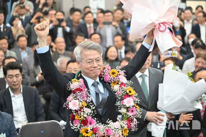 [광주=뉴시스] 이영주 기자 = 더불어민주당 전남광주통합특별시장 후보자로 선출된 민형배 후보가 14일 오후 광주 서구 자신의 선거사무소에서 꽃목걸이를 걸고 만세하고 있다. 2026.04.14. [email protected]