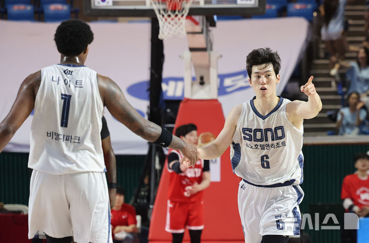 [서울=뉴시스] 권창회 기자 = 14일 서울 송파구 잠실학생체육관에서 열린 2025-2026 프로농구 6강 플레이오프 2차전 서울 SK와 고양 소노의 경기, 소노 이정현이 3점슛을 성공한 뒤 기뻐하고 있다. 2026.04.14. [email protected]