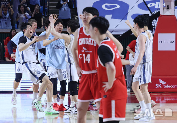 [서울=뉴시스] 권창회 기자 = 14일 서울 송파구 잠실학생체육관에서 열린 2025-2026 프로농구 6강 플레이오프 2차전 서울 SK와 고양 소노의 경기, 76-72로 이긴 소노 선수들이 기뻐하고 있다. 2026.04.14. [email protected]