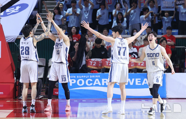 [서울=뉴시스] 권창회 기자 = 14일 서울 송파구 잠실학생체육관에서 열린 2025-2026 프로농구 6강 플레이오프 2차전 서울 SK와 고양 소노의 경기, 76-72로 이긴 소노 선수들이 기뻐하고 있다. 2026.04.14. [email protected]