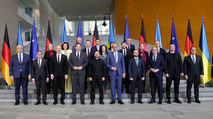 [베를린=AP/뉴시스] 볼로디미르 젤렌스키 우크라이나 대통령과 프리드리히 메르츠 독일 총리(이상 가운데)가 14일(현지 시간) 독일 베를린에서 정부 간 회의를 마친 후 양국 각료들과 기념 촬영을 하고 있다. 2026.04.15.