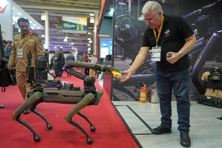 [상파울루=AP/뉴시스] 14일(현지 시간) 브라질 상파울루에서 열린 2026 라틴아메리카국제방산보안장비전시회(LAAD)에서 원격 조종 폭발물 처리 로봇이 시연되고 있다. LAAD는 중남미 최대 규모의 방산·보안 전시회이다. 2026.04.15.