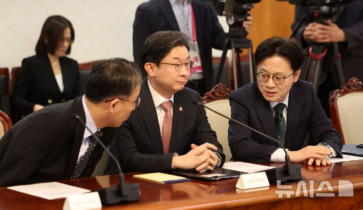 [서울=뉴시스] 김선웅 기자 = 김정관(오른쪽부터) 산업통상부 장관, 이억원 금융위원장, 이형일 재정경제부 1차관 15일 서울 종로구 정부서울청사에서 열린 제5차 비상경제본부 회의에서 이야기를 나누고 있다. 2026.04.15. [email protected]