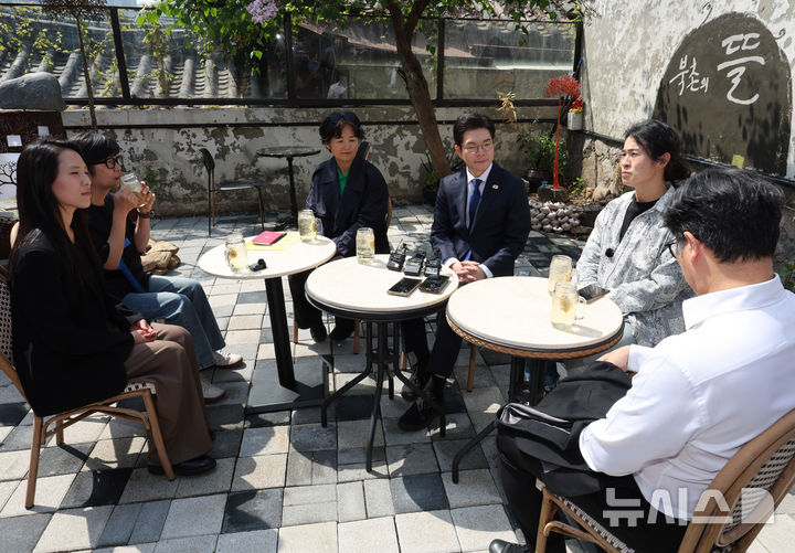 [서울=뉴시스] 배훈식 기자 = 찾아가는 서울人터뷰에 나선 정원오 더불어민주당 서울시장 후보가 15일 오전 서울 종로구 북촌의 뜰에서 지역 소상공인들과 간담회를 하고 있다. 2026.04.15. [email protected]