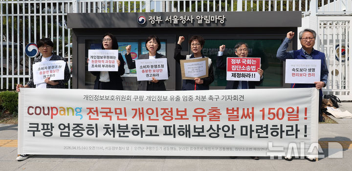 [서울=뉴시스] 김선웅 기자 = 안전한 쿠팡만들기 공동행동, 참여연대, 민주사회를 위한 변호사모임 등 단체가 15일 서울 종로구 정부서울청사 앞에서 기자회견을 열고 쿠팡 3300만 고객 개인정보 유출 사태에 대한 개인정보보호위원회의 엄중 처분, 과징금 상향, 피해자 보상을 위한 집단분쟁조정 개시 등을 촉구하고 있다. 2026.04.15. [email protected]