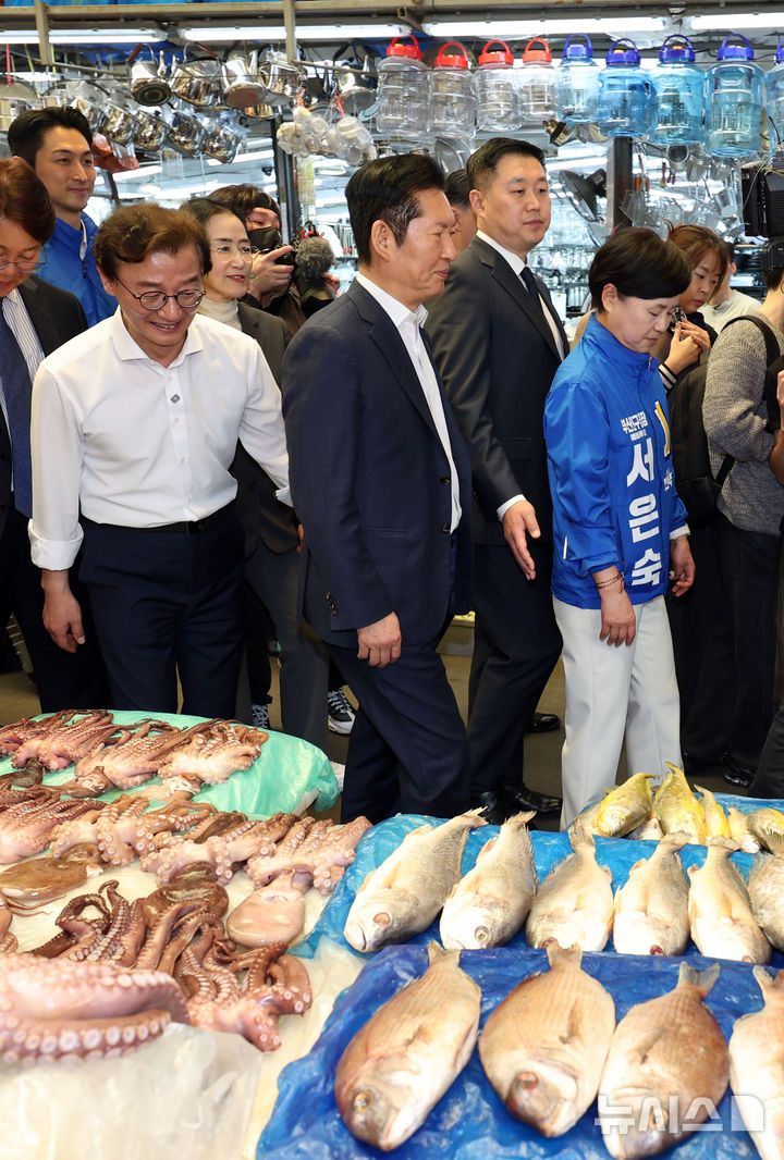 [부산=뉴시스] 하경민 기자 = 정청래 더불어민주당 대표가 15일 부산 부산진구 부전시장을 방문, 상인들과 인사하며 전재수 부산시장 후보 등 6·3 지방선거 후보들의 지지를 호소하고 있다. 2026.04.15. [email protected]